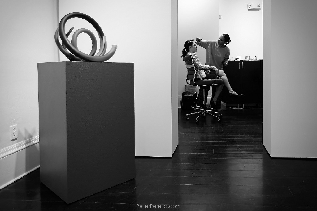 49E13791 Makeup artist Jayliana Brito prepares New Bedford Art Museum director Suzanne de Vegh for a photo shoot. In the foreground Radio Loops by Pual Seides is one of the many glass pieces featured in Pathfinders: Paving the Glass Revolution in the U.S. opening soon at the museum.