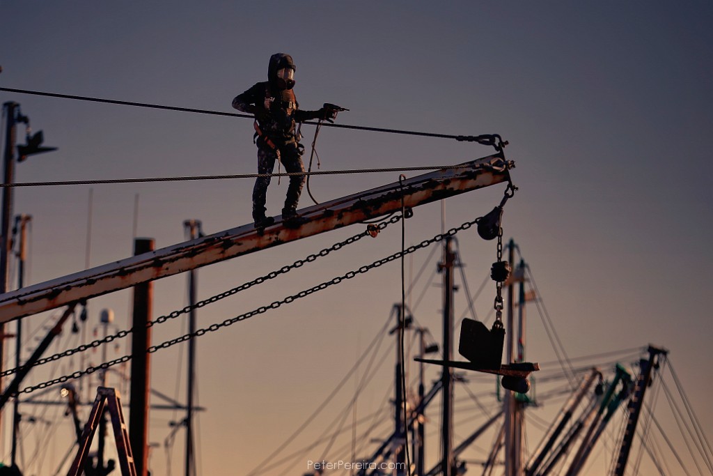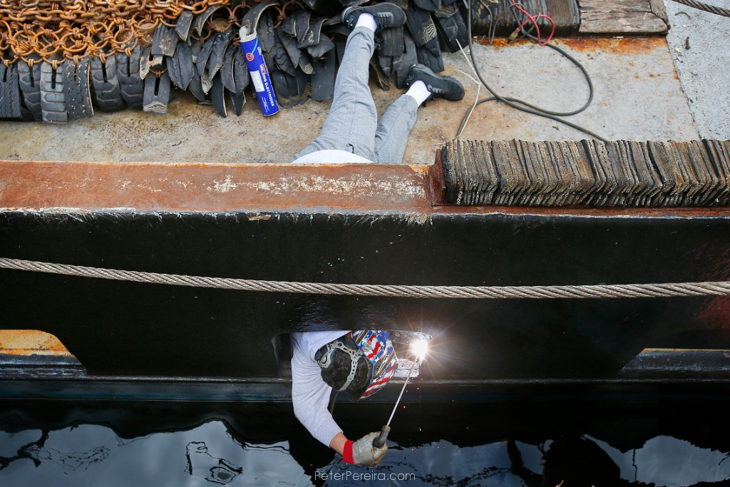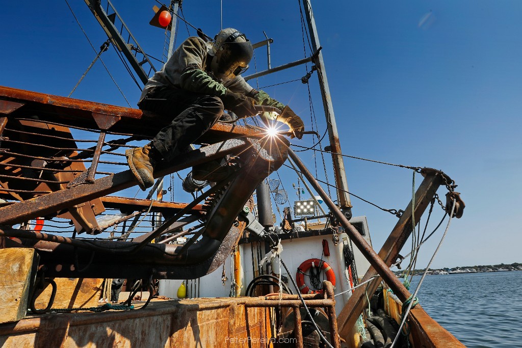 100_M1A6092 Chris Macedo of Macedo Welding finds himself perched atop a dredge as he makes repairs to the skid plats of the sea clam fishing boat docked in New Bedford