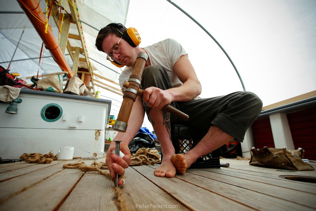 29E14172 GarettEisele, of Clark & Eisele Traditional Boatbuilding, uses a mallet and a calking iron, to install new tarred hemp fiber into the gaps between the planks on the foredeck of the Ernestina-Morrissey schooner docked at State Pier in New Bedford.