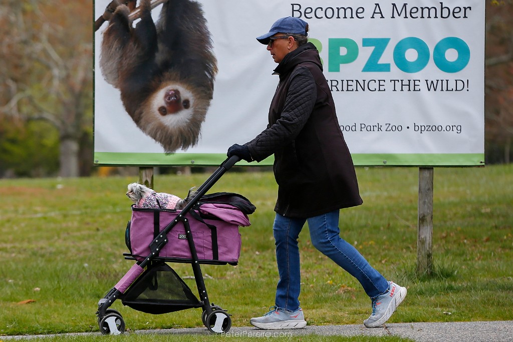 54E14648 A two-toed sloth looks on curiously as a woman walks her dog in a cart past a Buttonwood Park Zoo poster in New Bedford.
