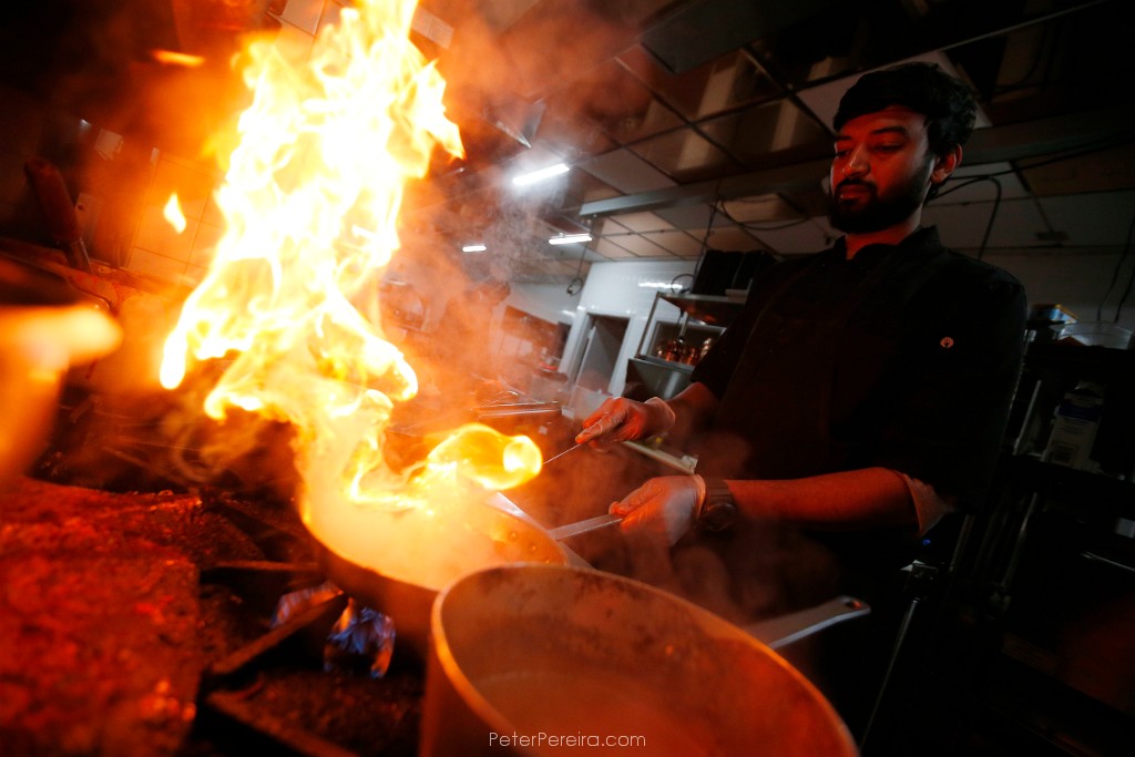 13E14951 Ritesh Vaze sends flames into the air as he prepares various dressing in the kitchen of the newly opened Safron by the Sea in Fairhaven.
