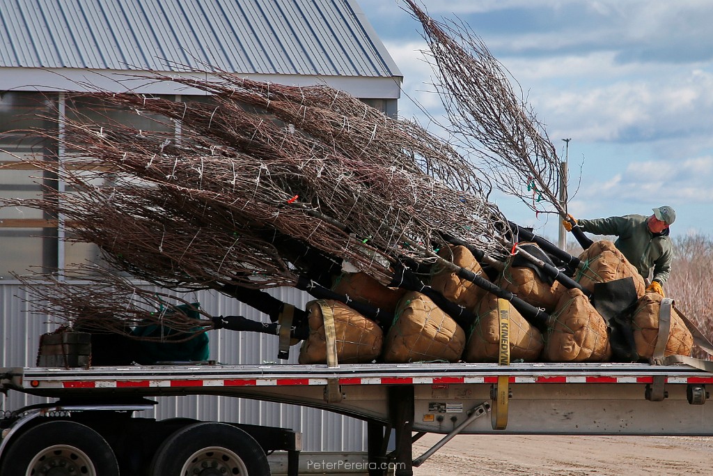 32E15012 Peter Thornton, owner of Sylvan Nursery in Westport, unloads tupelo trees from the back of a truck as the first shipment of trees arrives in preparation for Spring season.