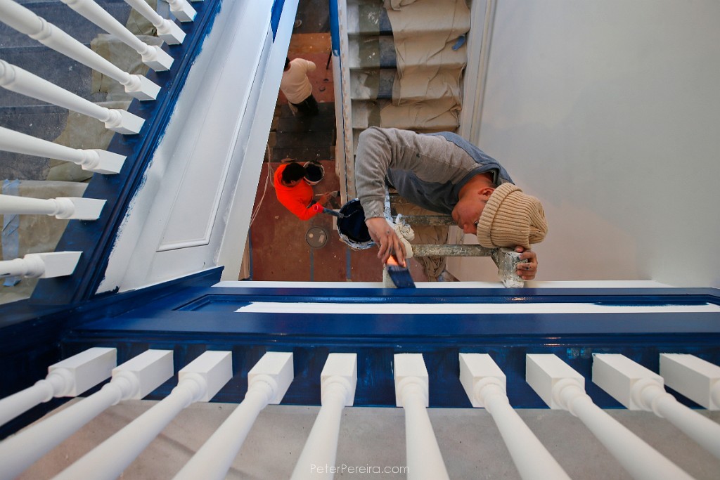 8E15318 Painters put the final touches on the stairwell at the former Holy Family High School building which has been converted into housing.