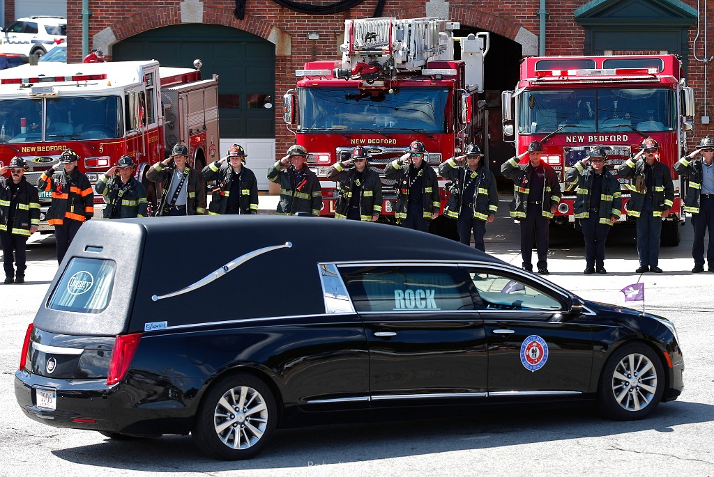 93E15454 Station 9 firefighters salute the hearst carrying New Bedford firefighter Matthew Forand who died while on duty. Station 9 was firefighter Forand's base.