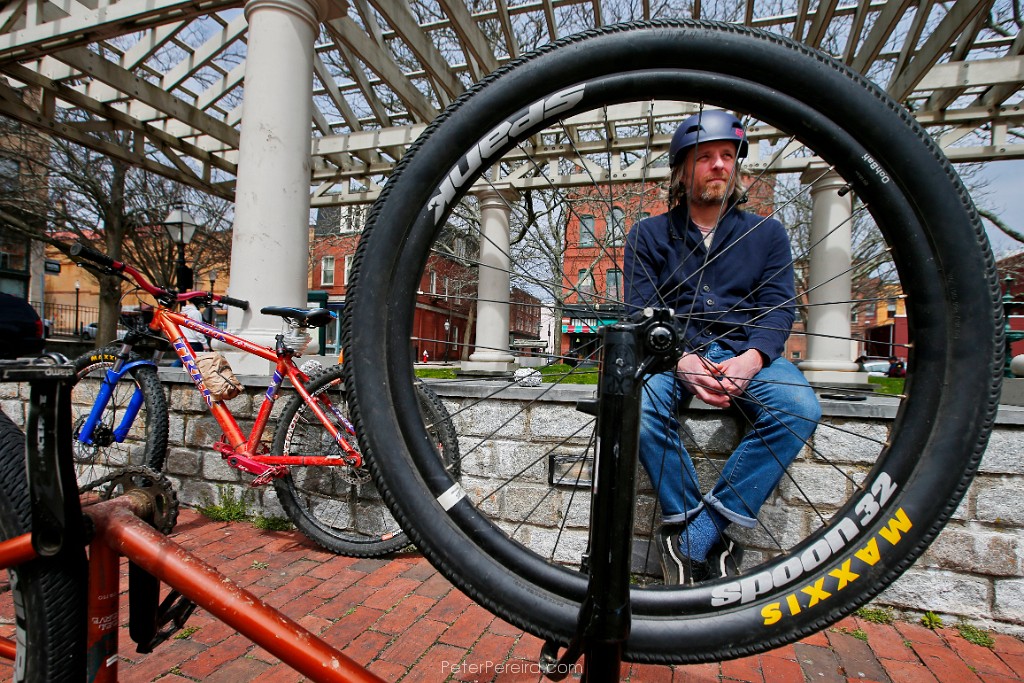 52E15470 Adam Wells is seen through the wheel of one of his sons bike wheels while sits on the retaining wall while his kids are free to play at Custom House Square in New Bedford during a bike ride.