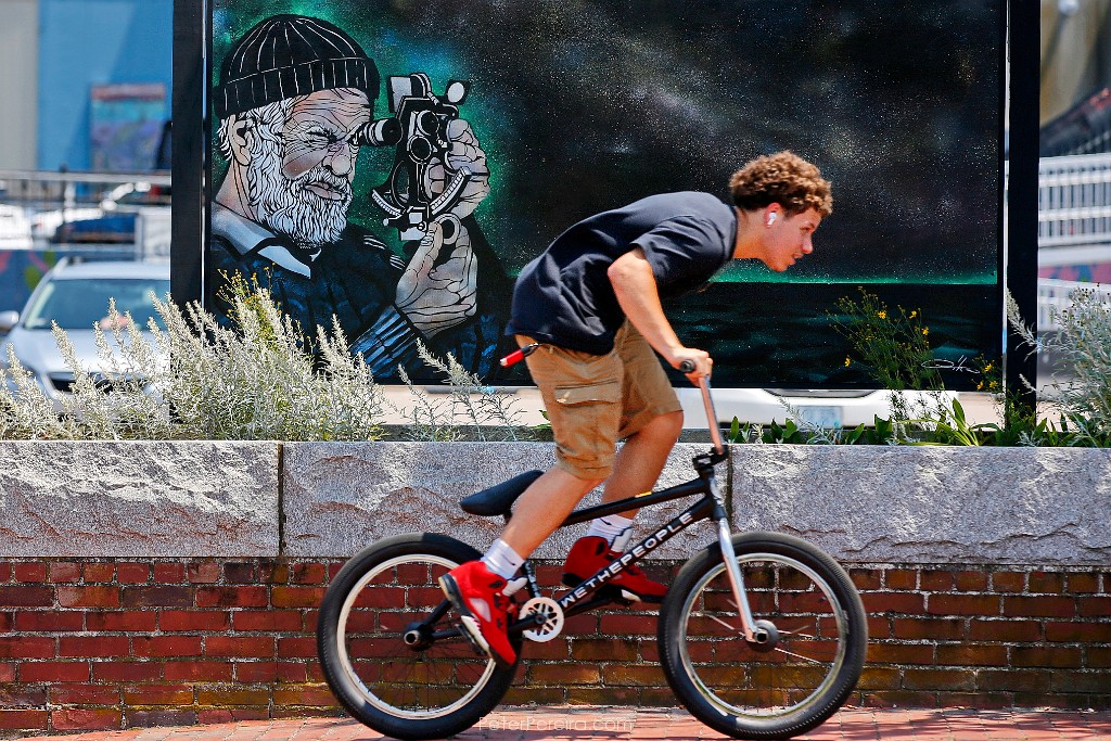 77E15486 A young man rides his bicycle up MacArthur Drive in New Bedford past a painting of a sailor using a sextant.
