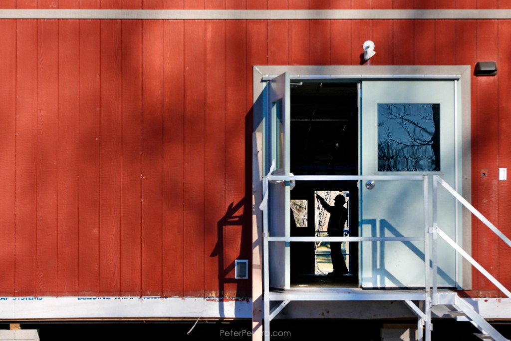 14E15560 A worker is seen through the open door of the temporary trailers being installed at Umass Dartmouth to house professors and students during renovations to the Group 1 building.