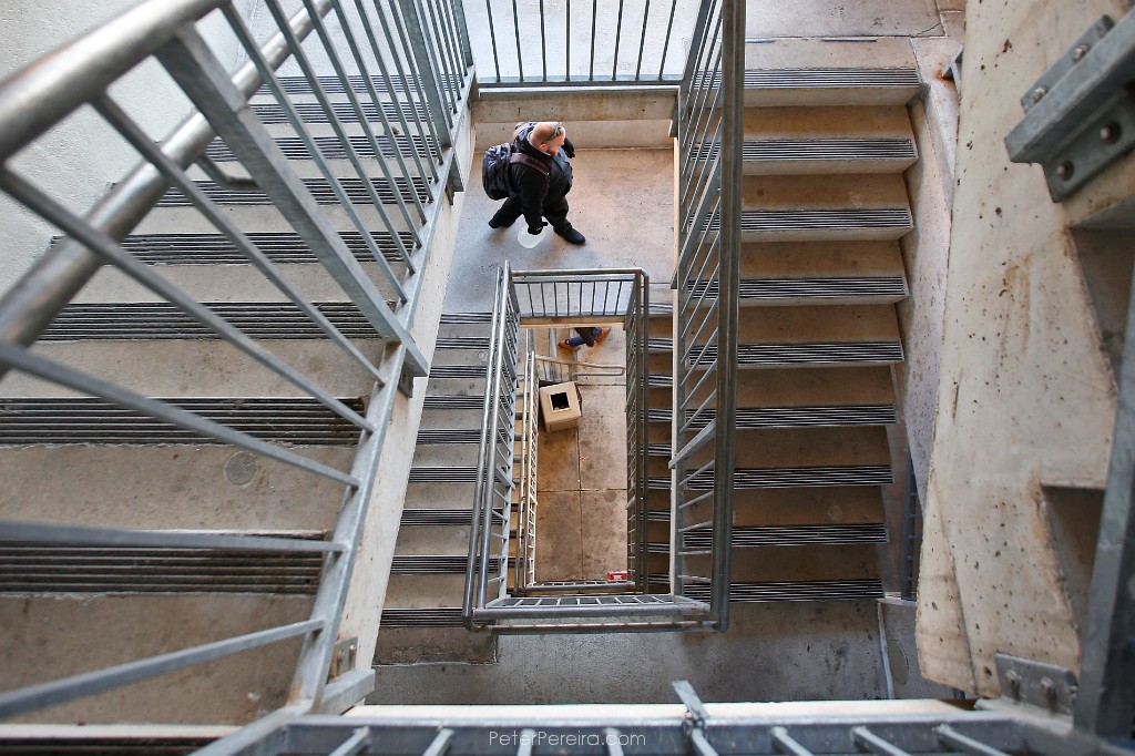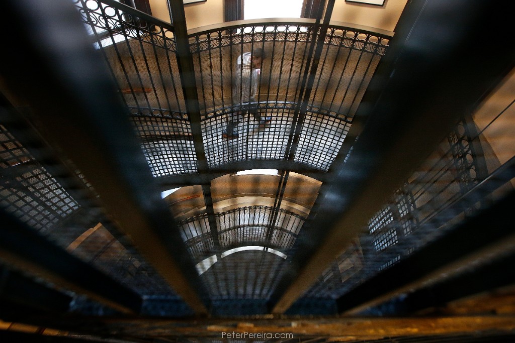 23E19564 A man walks down the steps which wind around the outside of the historic elevator at New Bedford City Hall.