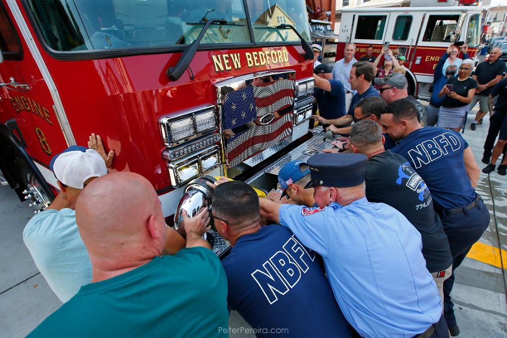 78E15674 New Bedford firefighters push the new Engine 8 fire apparatus into the garage as part of a ceremony steeped in tradition. The new $750,000 fire truck replaces the 16-year-old previous Engine 8, seen in background, at Station 8 on Acushnet Avenue in New Bedford.