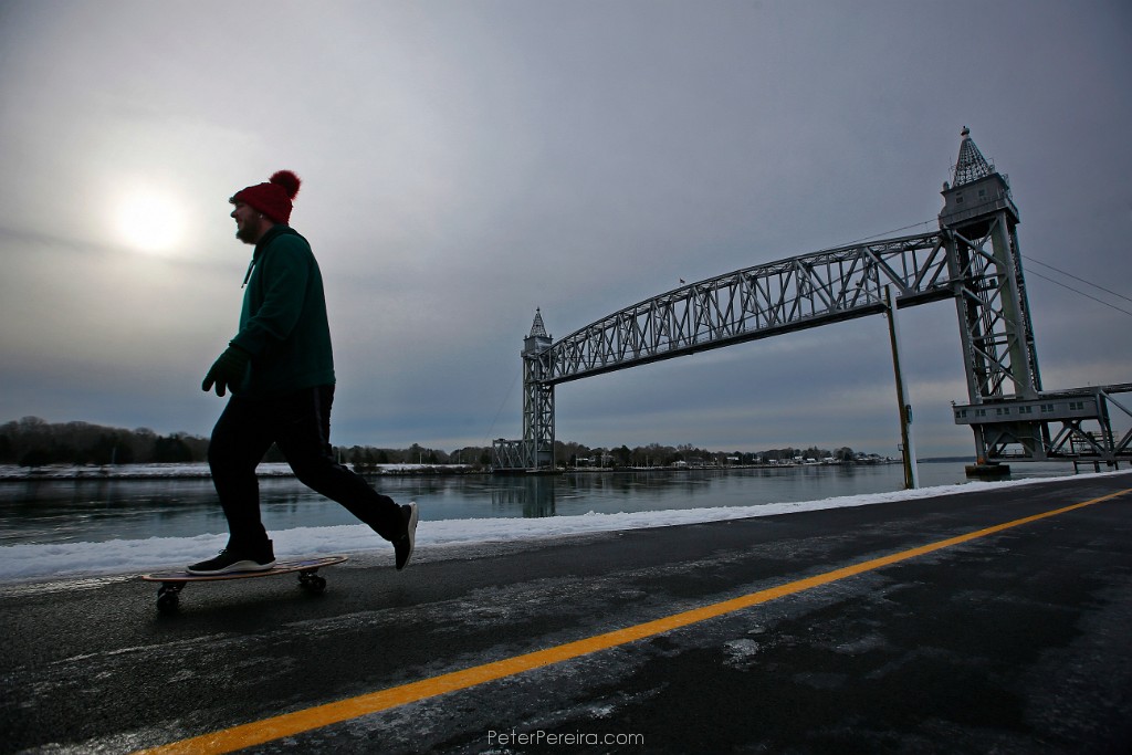 16E15993 A man rides his skateboard along the Cape Cold canal in Buzzards Bay, in the background the iconic rail bridge.