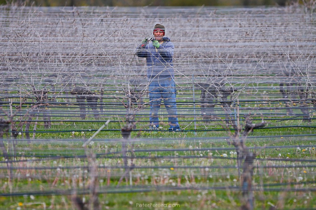 57E16372 Luis Quezada is seen between the steel cables that hold up the vines as he trims them in preparation for growing season at Westport Rivers Vineyard & Winery in Westport.