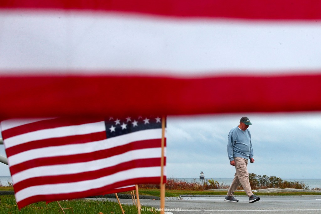 117E17353 A man walks past a series of American flags placed on the edge of Fort Street at Fort Phoenix in Fairhaven. In the background the Butler Flats lighthouse can be seen.