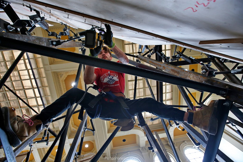 11E17500 Nicholas Chrusten hangs between supporting beams as he constructs the walls of the soon to open Boulder Union climbing gym inside the former New Bedford Institute for Savings historic building on Union Street in downtown New Bedford.