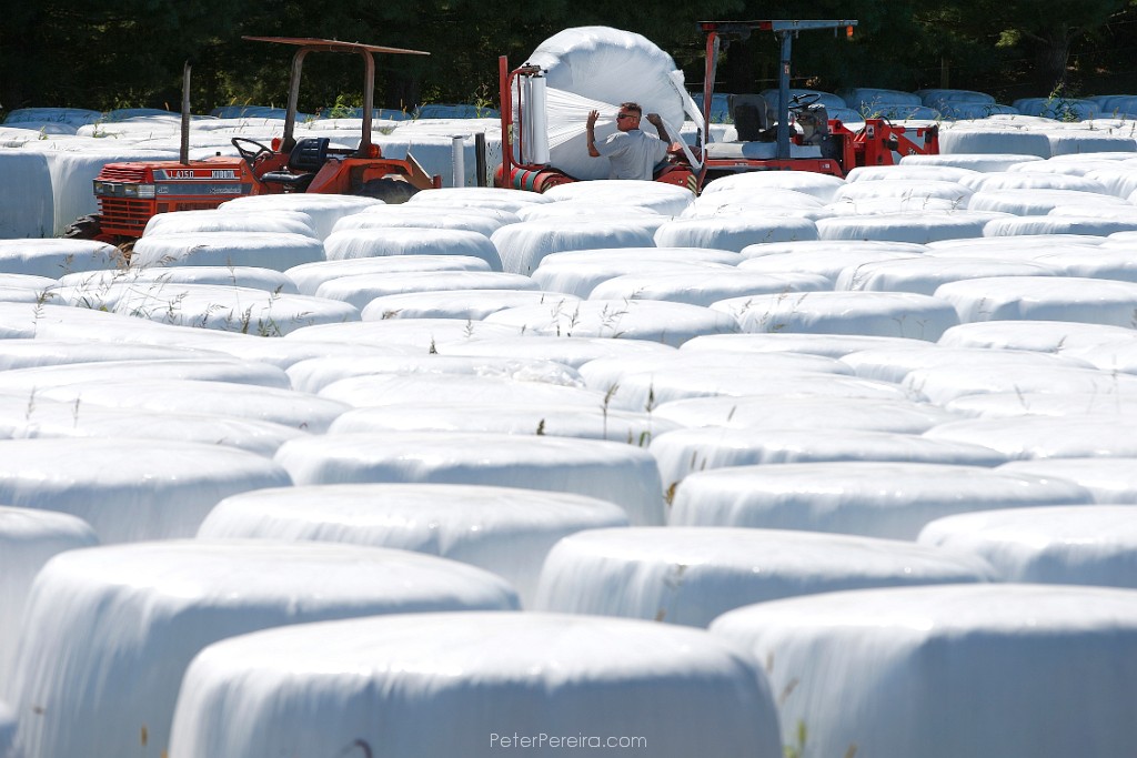 96E17610 Jimmy Borges of Sylvan Nursery is surrounded by over two thousand hay bales wrapped in cellophane as he tries to finish wrapping the final bales on a field in Westport in preparation for the fall season. These bales will eventually be used to feed beef cows.