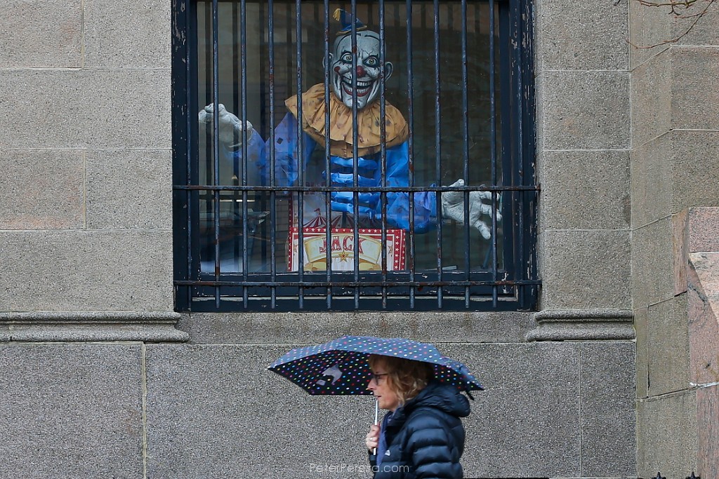 21E17737 A woman walks past a scary Jack in the Box installed behind a window on the Union Square building on Union Street in New Bedford.
