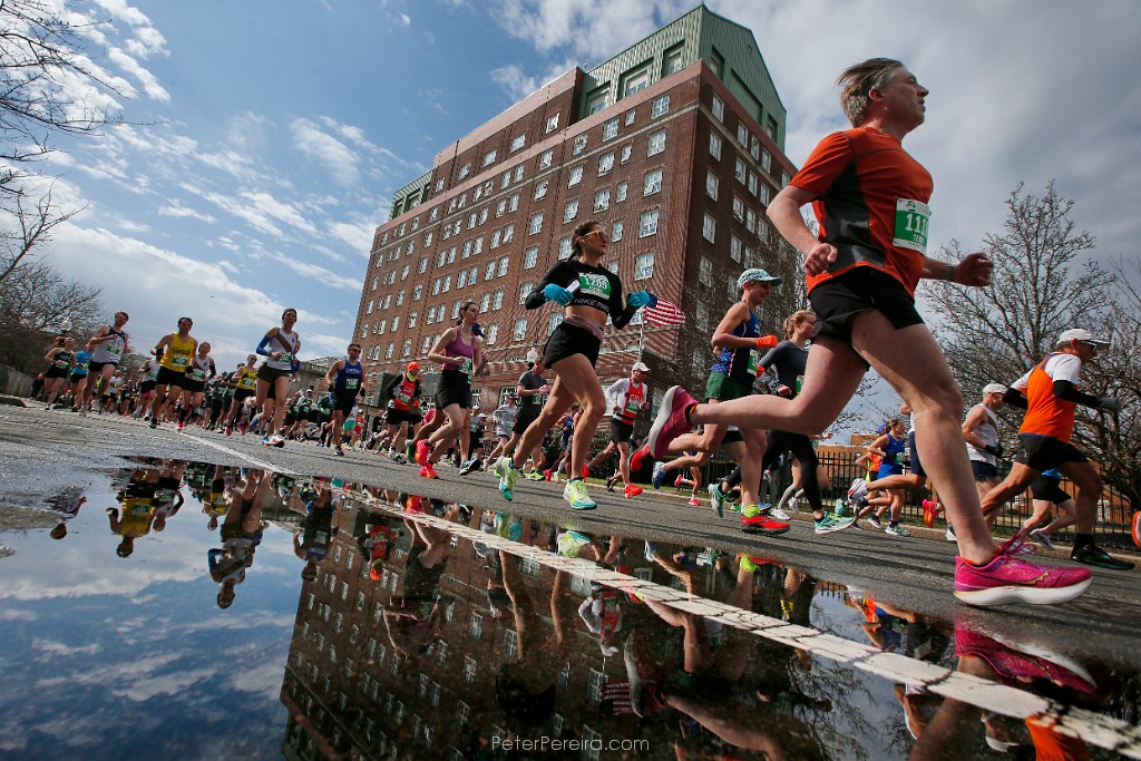 40E17919 Runners are reflected in a puddle, as them make their way up Pleasant Street during the 2024 New Bedford Half Marathon on March 17, 2024.