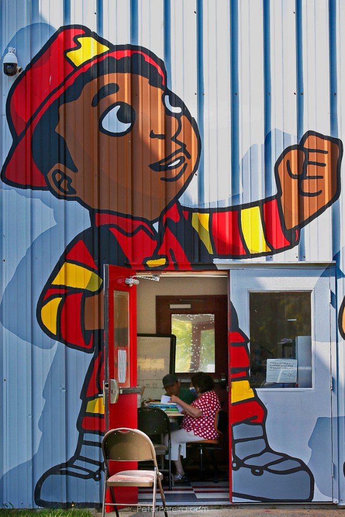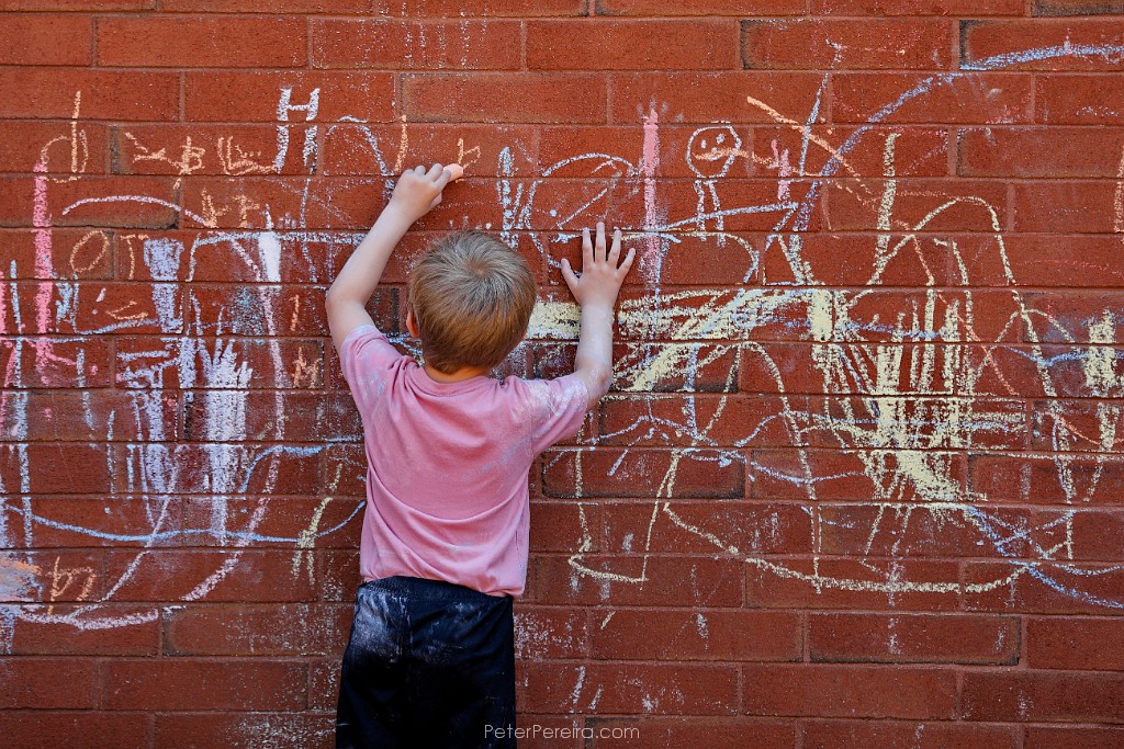 87_M1A0394 A young boy in the YMCA Preschool program in downtown New Bedford, lets his creativity flow with caulk on the building's red brick wall.