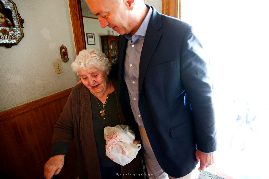 41E18651 Maria Amaral is overcome with emotion upon realizing that Mayor Jon Mitchell is the one delivering her meal today as part of the Coastline Elderly's Meals on Wheels program. Mrs. Amaral is blind and at first was not aware that her meal was being delivered by a different person today.