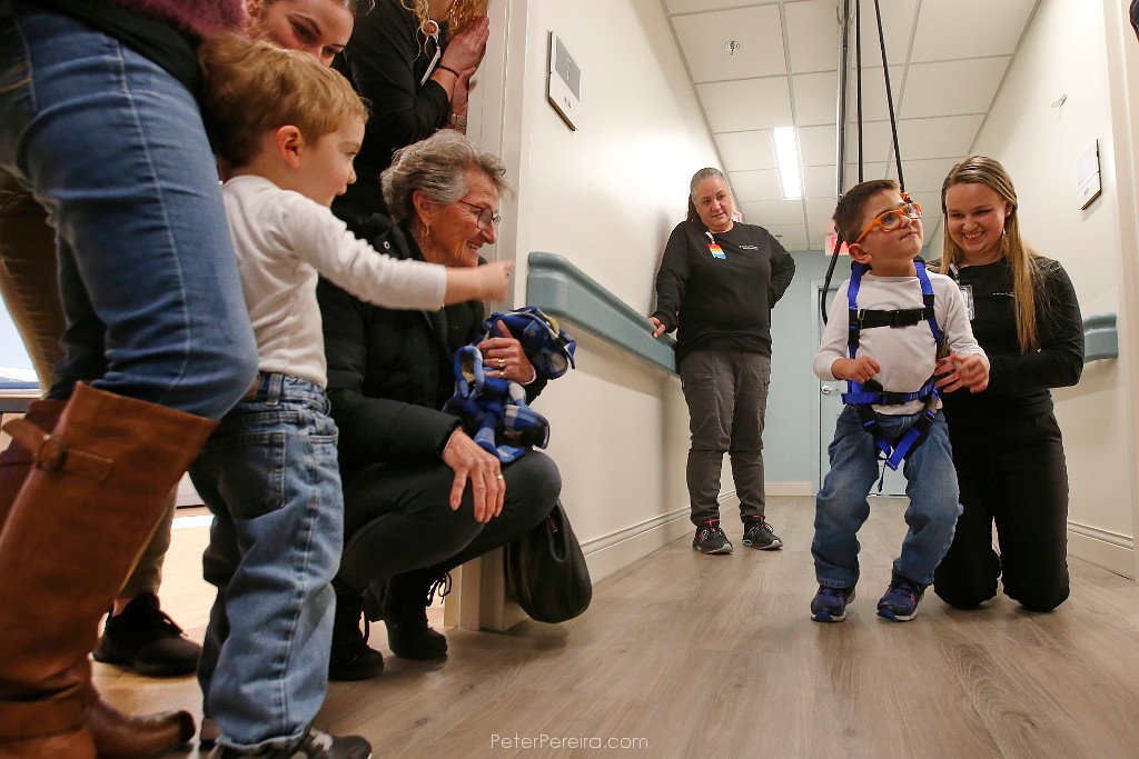 42E19383 Austin Carrita, 2, points at his brother Grayson Ferreira, 6, who was diagnosed with cerebral palsy at birth, as he walks alone with the assistance of a suspension system installed at the new Southcoast Health Pediatric Rehabilitation Program building on Acushnet Avenue in New Bedford. Next to himErica Keisling, physical therapist, encourages Grayson to walk on his own.