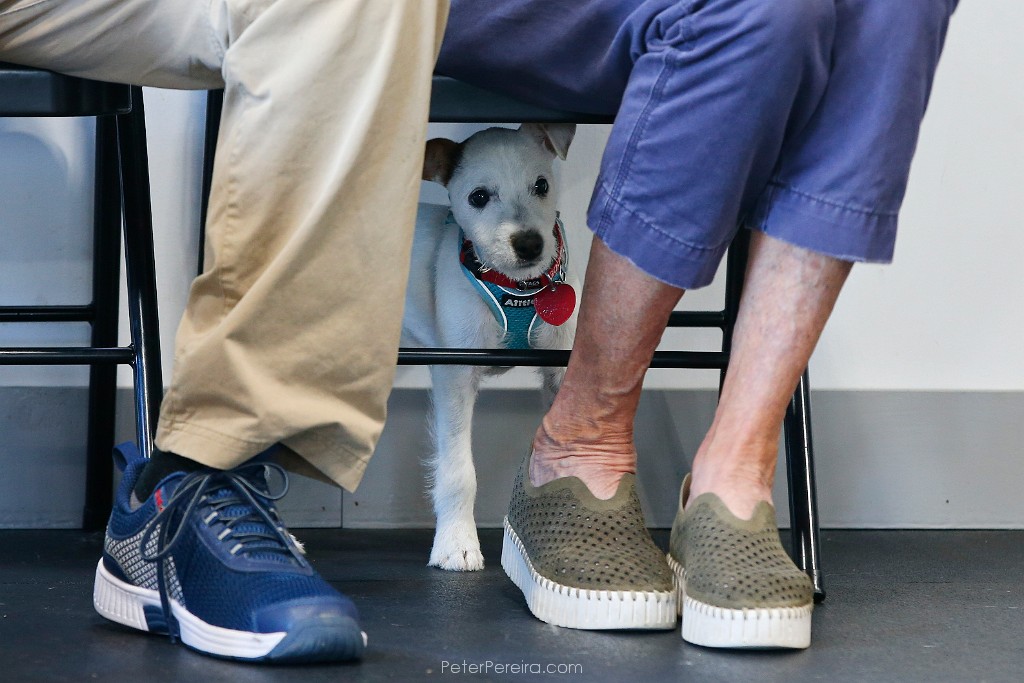65E19520 Goose hides under his owners legs, Sam and Soo Barnard during a puppy class at the Eric Letendre Dog Training School on State Road in Westport