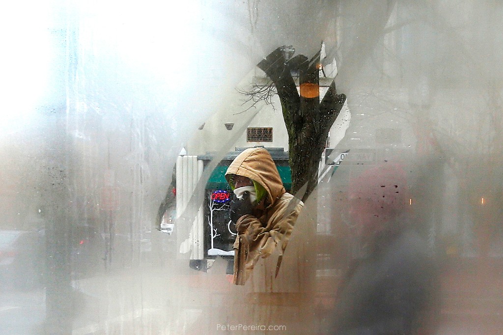 22E1_9708resize A man tries to keep his face warm as he makes his way across a gap in the steamed windows of No Problemo in downtown New Bedford on a frigid morning.
