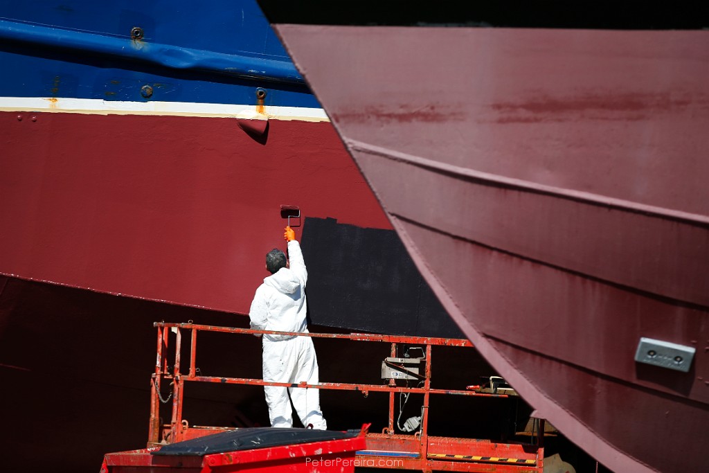 39E19781 A painter puts a fresh coat of paint on the hull of a fishing boat undergoing repairs at Fairhaven Shipyard.