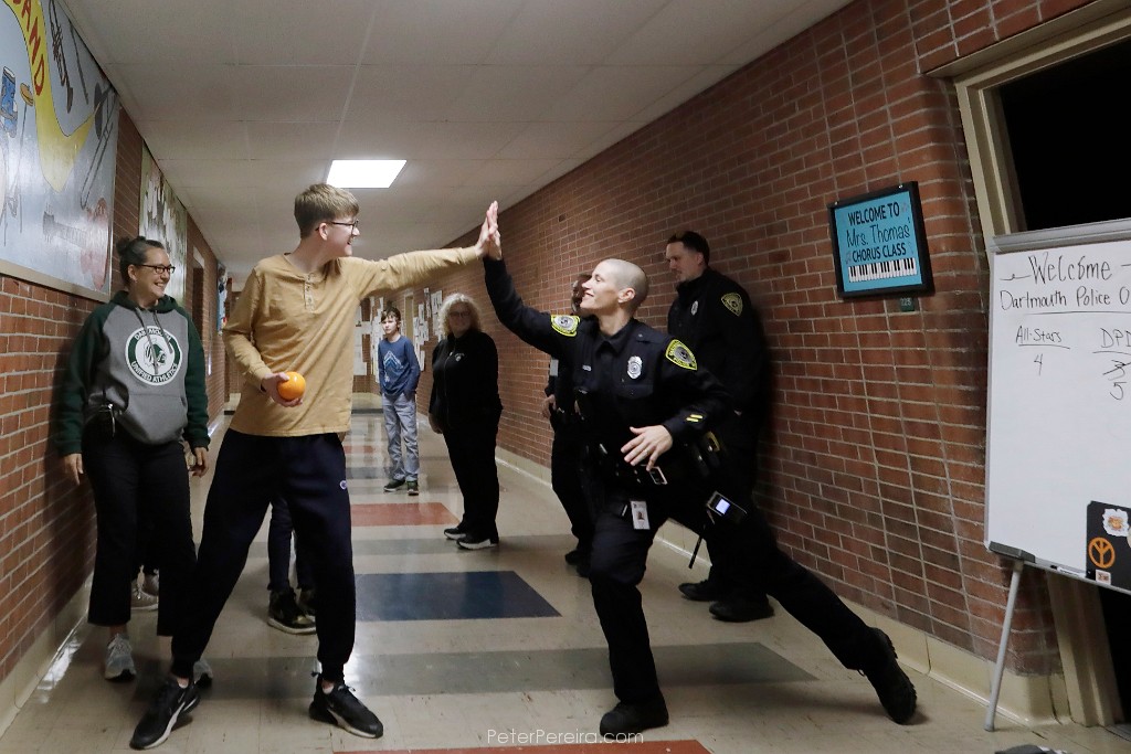 130_M1A0344 Dartmouth Middle School student James high-fives Dartmouth Police elementary resource officer, Amanda Tavares, during a game of Bocce ball in the school's hallway.