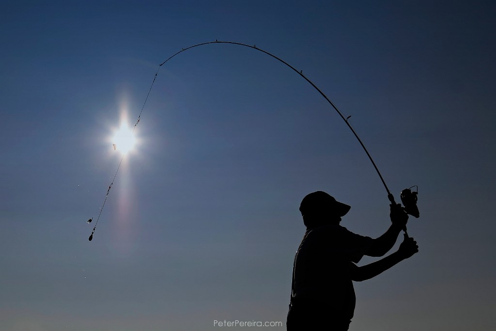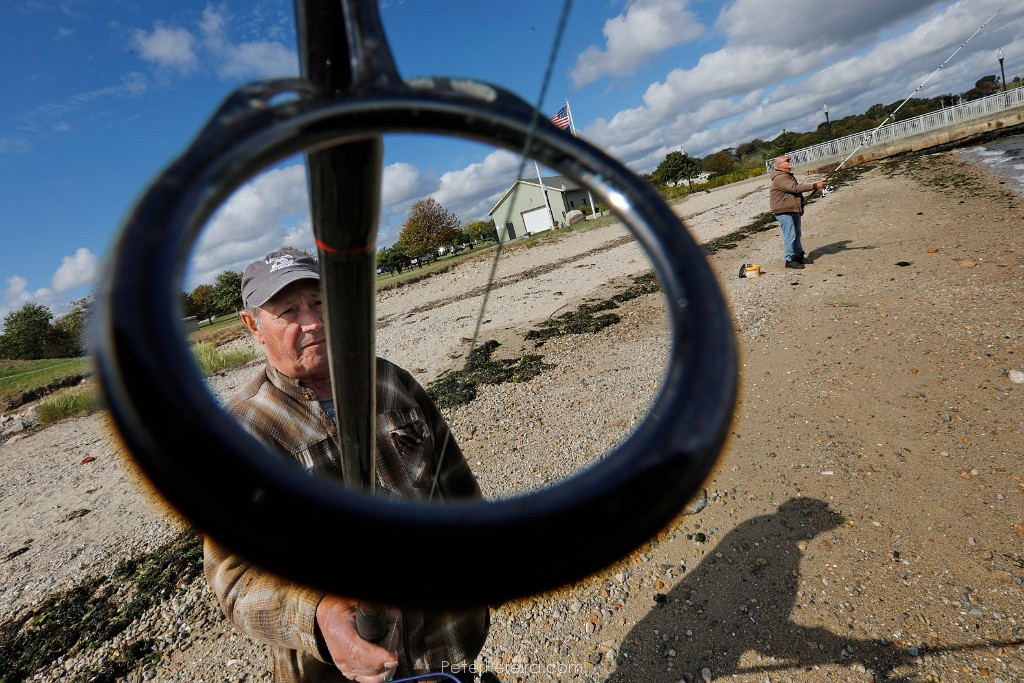 104_M1A0590 With finger on the line, Arlindo Vitorino is seen through one of the guides on his fishing rod as he and Herve Fernandes are seen fishing at Fort Taber Park in New Bedford. PHOTO PETER PEREIRA