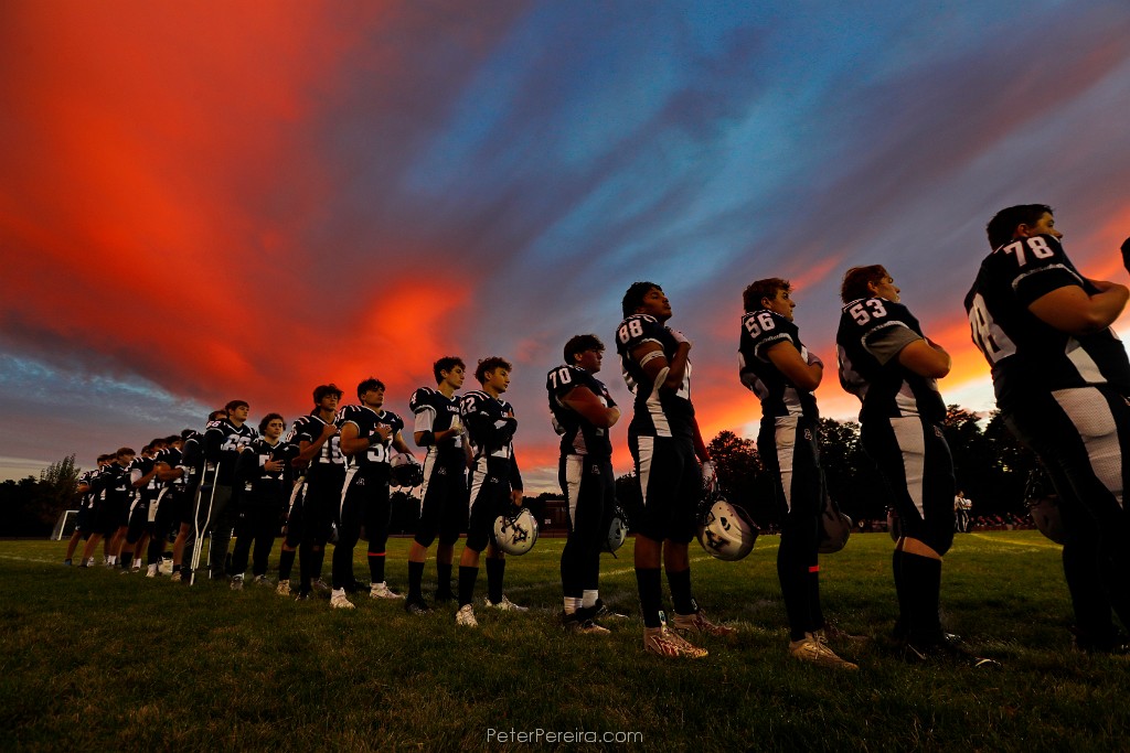 105_M1A0701 The sun sets in the distance as Apponequet Regional High School players listen to the National Anthem before playing Dartmouth High School on Friday night football.