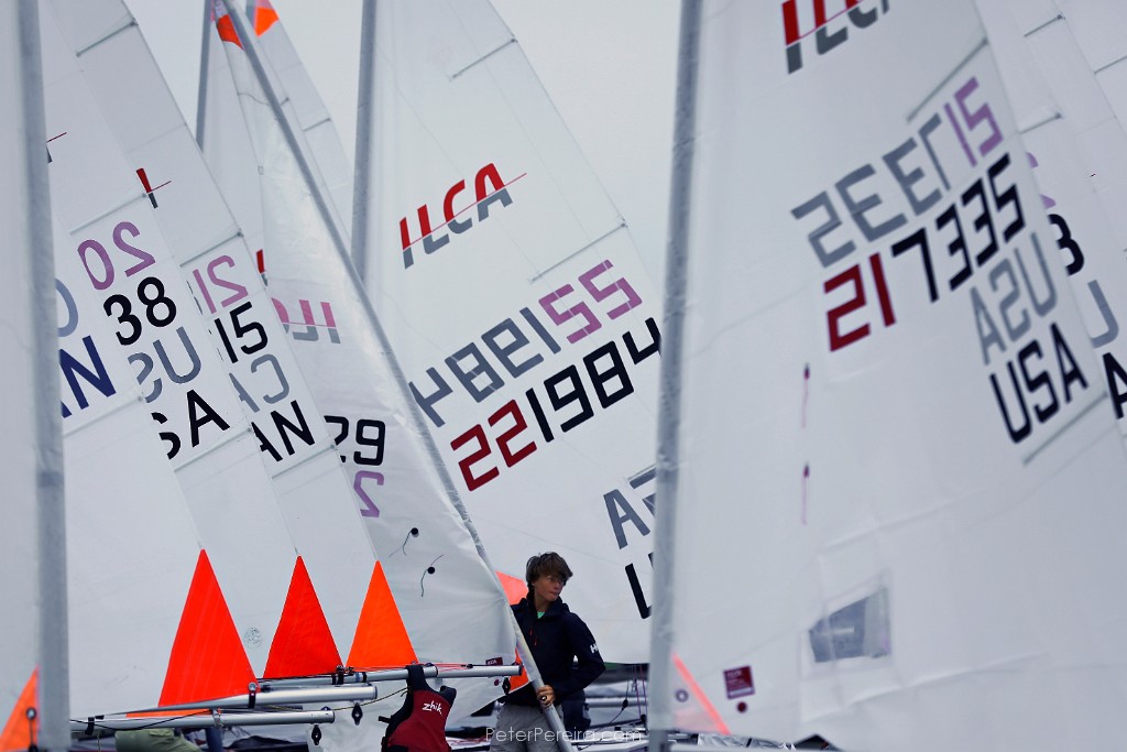 63_M1A1359 A sailor maneuvers his sail into position as he and fellow sailors competing in the ILCA North American Championships prepare their boats at the New Bedford Yacht Club in Dartmouth. The event will run between June 6th through June 9th off of Padanaram Harbor in Dartmouth.
