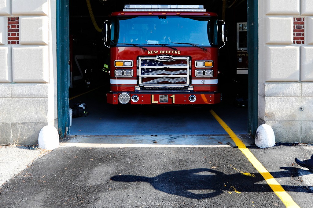 112_M1A3217-2 A firefighter walks past the entrance to where the new Ladder 1 truck is parked at Station 2 in New Bedford.
