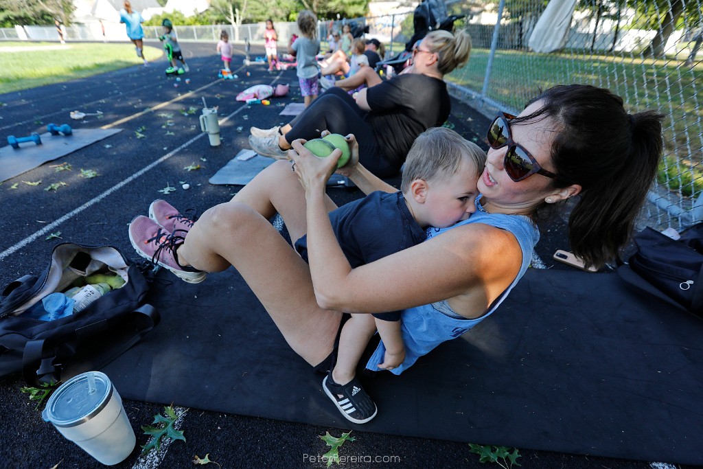 95_M1A3281 Sarah Freshman tries to work with weights as her son Wesley Freshman, 1, rests on her chest during the I Stroll Southcoast weekly workout session at Cushman Park in Fairhaven for mom with young children who want to work out.