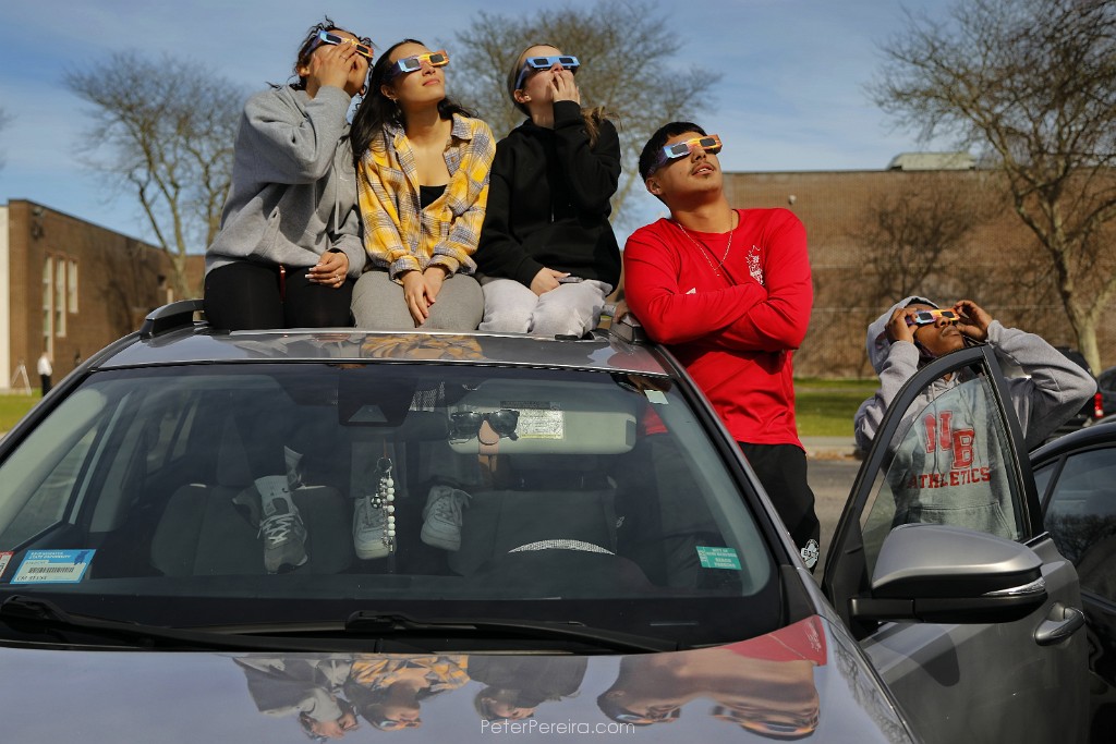 48_M1A3303 New Bedford High School students look at the solar eclipse from the the sunroof of their vehicle in New Bedford, MA on April 8, 2024.