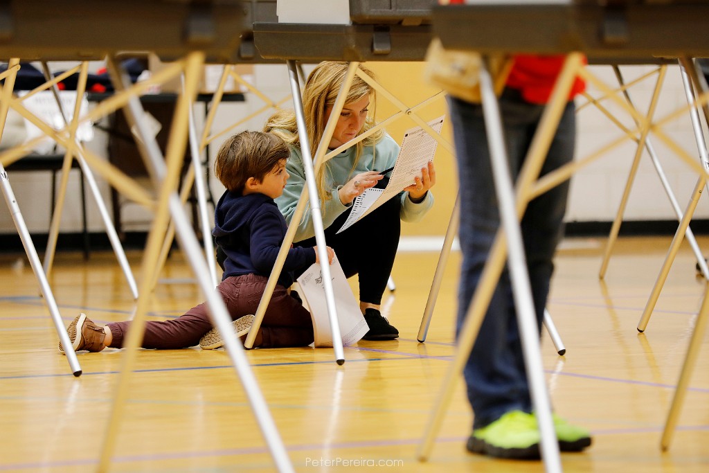 114_M1A3875 Maggie Toland kneels down so her son Cameron Kennedy, 4, can be part of her voting process at the Fairhaven Recreation Center polling staion on Election Day, Nov. 5, 2024.