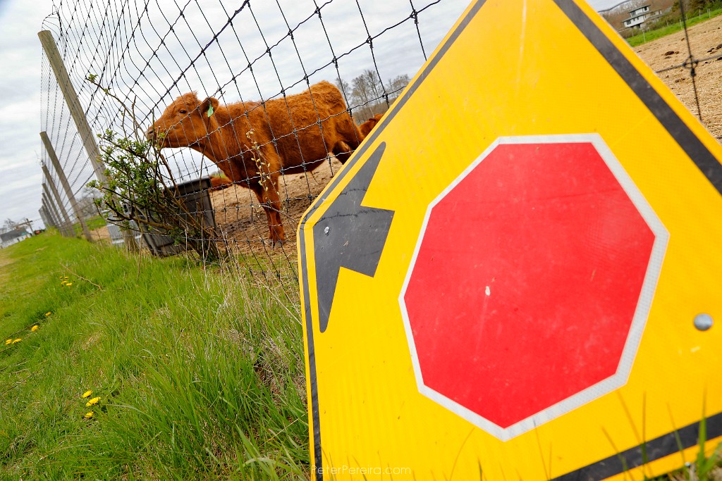 53_M1A4813 A young calf does not heed to the stop sign as it continues to eat from a bush growing outside of its enclosure in Westport.
