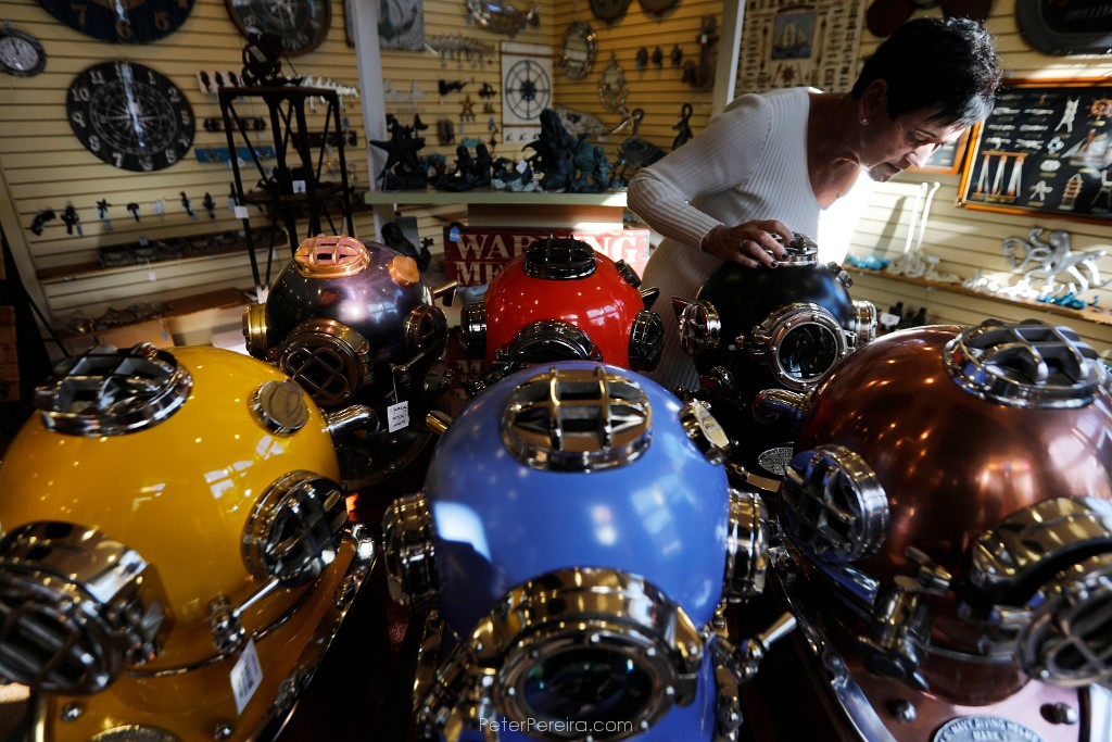 118_M1A5287 Karen Wallace, manager, aligns the blue colored diving helmet for sale at Moby Dick Nauticals in downtown New Bedford.