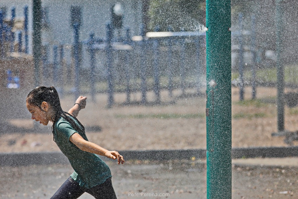 67_M1A5439 A girl runs through the fine water mist thrown up by the sprinklers at Clasky Common Park in New Bedford on a sweltering day.