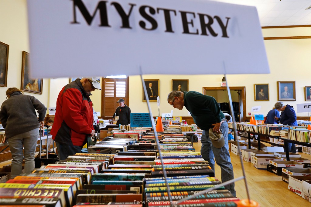 56_M1A6282 People browse through the books for sale at the annual Friends of Elizabeth Taber Library book sale held at the Marion Music Hall. The book sale will happen on May 10th and May 11th.