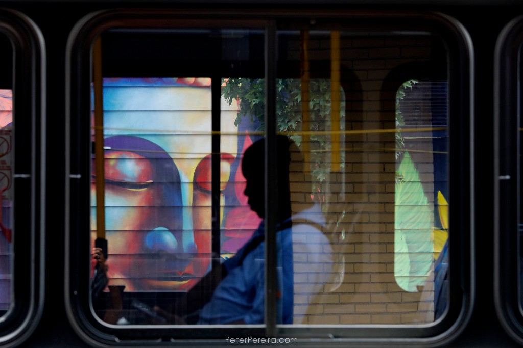 73_M1A6896 A man rides the bus as it makes its way past the mural of a Buddah painted on the side of the Spicy Lime building in downtown New Bedford.