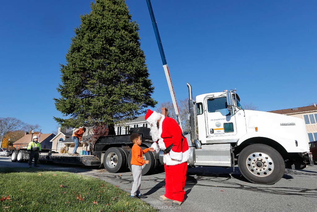 119_M1A7321 Kyrin DePina, 4, walks over to shake Santa's hand, as New Bedford Highway Department and Greenspace crews cut the tree across the street from his house, before trainsporting it to its final location in front of the Public Library downtown where it will become the official New Bedford Christmas tree.