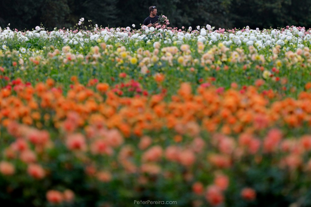 102_M1A7343 Tucker Manley, owner, is surrounded by colorful dahlias as he picks pink ones at the new Russells Mills Flower Co. field off of Horseneck Road in Westport.