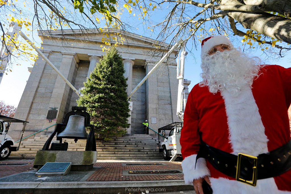 120_M1A7798 Santa (Nicholas Riquinha, New Bedford Highway Department and driver of the truck which carried the tree) looks on as New Bedford Highway Department and Greenspace crews place the 2024 Christmas tree into position in front of the New Bedford Public Library downtown.