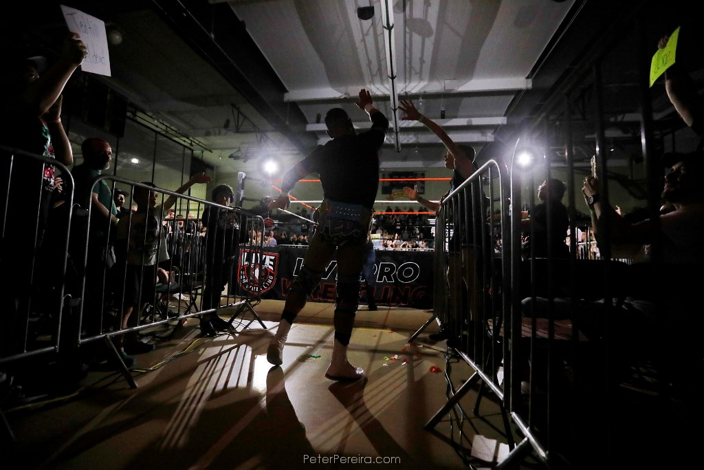 103_M1A8045 Ted Bolduc, 'Teddy Goodz' storms into the filled gymnasium, while high-fiving kids waiting to see his final wrestling match held in the Voc-Tech gymnasium in New Bedford.