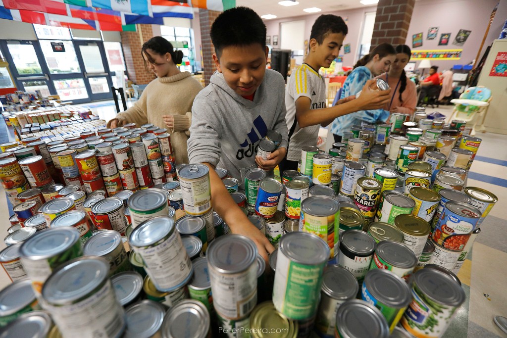 123_M1A8517 Alex Calel Mateo, 13, and fellow Normandin Middle School eighth graders sort the over three thousand cans they collected throughout the school year to give to the needy for Thanksgiving.