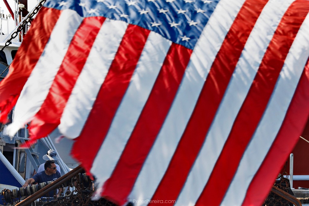 81_M1A8832 A fisherman on a scalloper tied in New Bedord harbor is seen behind the American flag hanging from the stern of the schooner Ernestina-Morrissey at State Pier.
