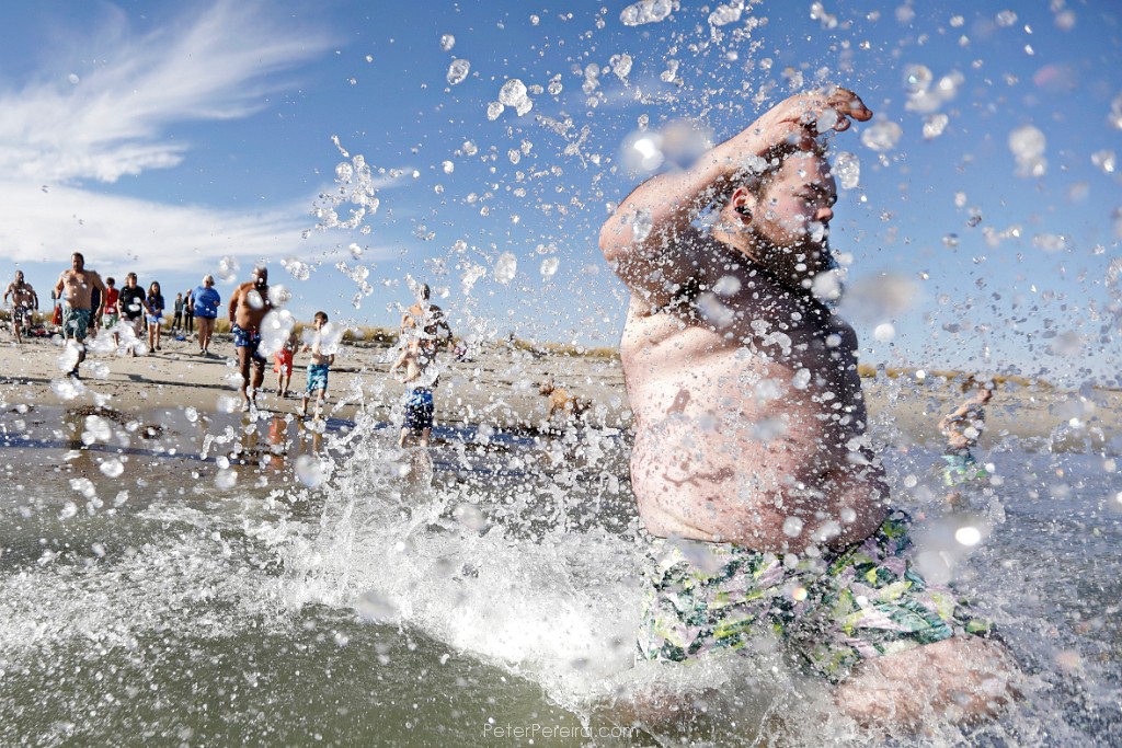 6_M1A9481 Tyler O'Driscoll sends water flying into the air as he and fellow participants jump into the cold waters off Gooseberry Island in Westport during the annual Plunge of the Faithful. The event is held in memory of Shannon O'Driscoll who was killed in 2006 by an SUV driver while holding a sign supporting organized day care programs in the state. This is part of a fundraiser, which has raised over 20K dollars since it began.