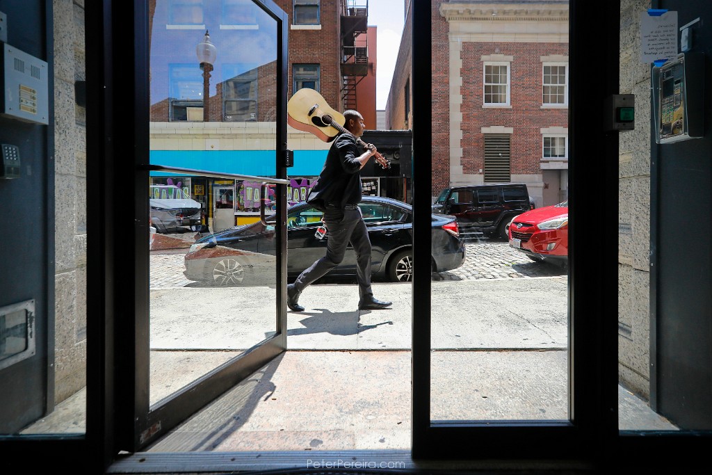 60_M1A9874 Hugo Amarante walks up William Street with a guitar on his shoulder past the open door of an apartment complex. When asked where he played his guitar, he responded "If someone needs to feel better, I will play the guitar for them"