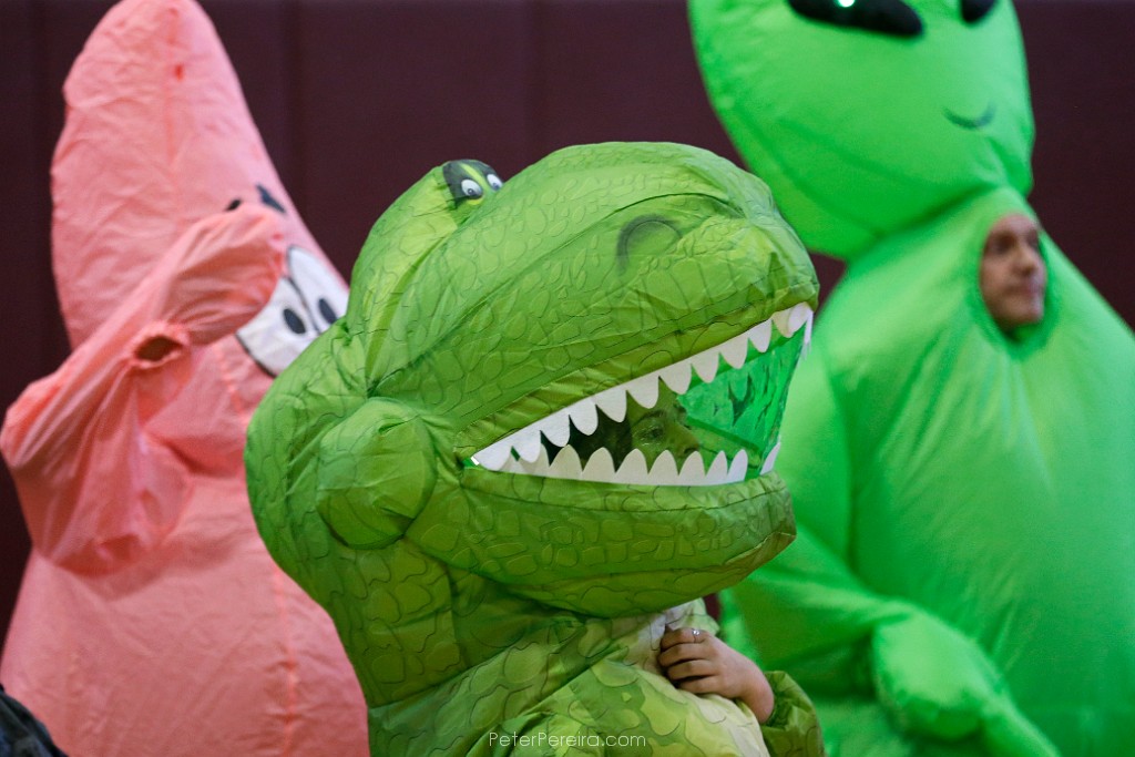 124_MUN0747 Roosevelt Middle School math teacher, Rylee Gonsalves, tries to see out of her dino suit before running against fellow teachers during the school's annual rally before the holiday season.