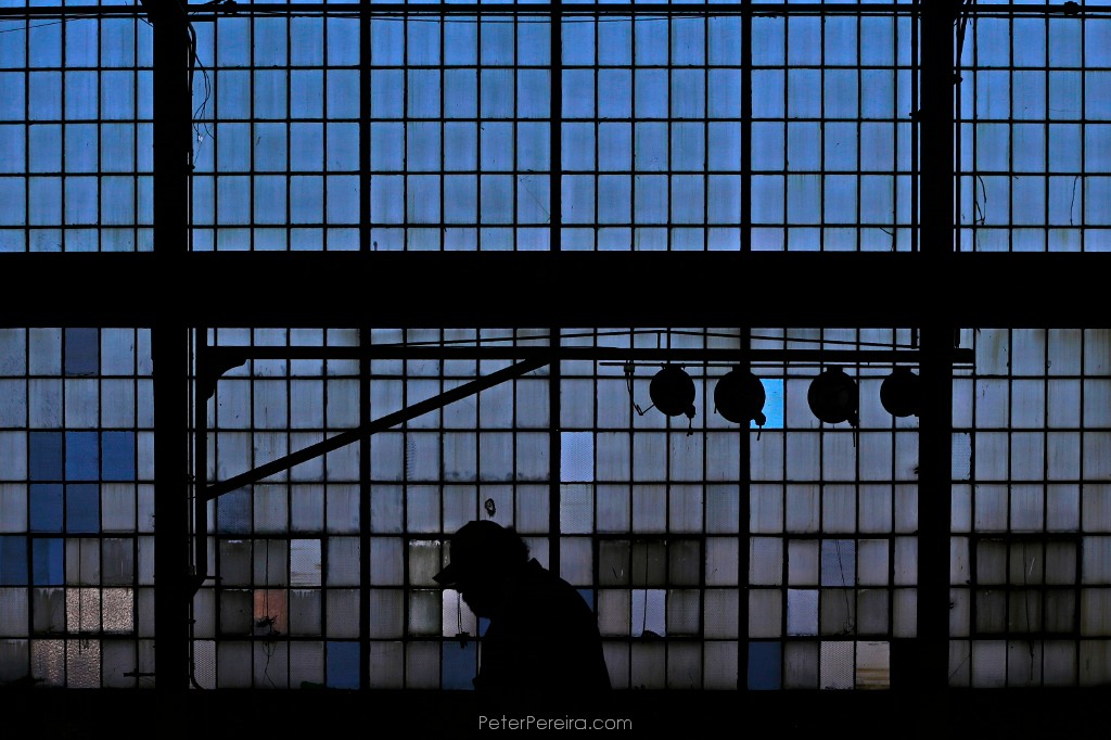 129_MUN2583 A worker walks past the historic glass pane wall of the former Revere Copper plant in New Bedford which is now the Shoreline Offshore maritime yard.