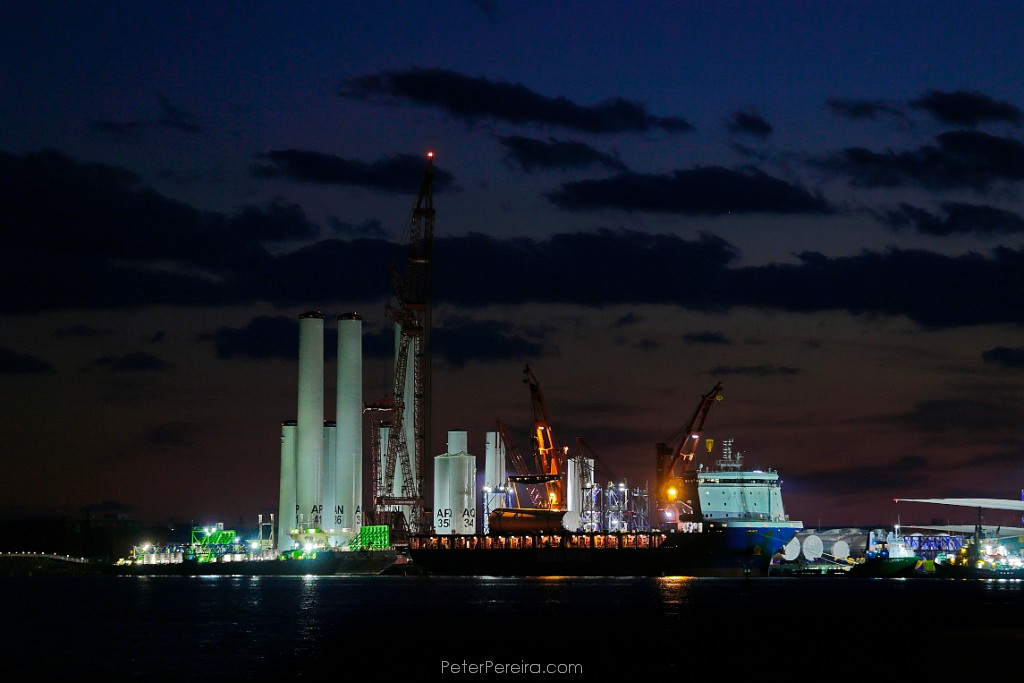 133_MUN3638 A ship carrying a tower for the Vinyeard Wind offshore wind farm is seen docked on the New Bedford Maritime Terminal as the sun sets.
